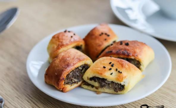 Stavite testo na pobrašnjenu površinu. Podelite na više delova i svaki deo razvaljajte u tanak pravougaonik. Nanesite nadev duž svakog pravougaonika i zatim umotajte rolnu. Svaku rolnu isecite na male parčiće i poređajte u pleh za pečenje obložen pek papirom. premažite belancetom i pospite susamom ili kimom. Pecite na 180°C oko 10 minuta dok ne porumeni.