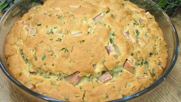 U činiji prosejte brašno, so i prašak za pecivo. Dobro promešajte i sipajte mleko, jaja i istopljeni puter. Sve lepo sjedinite. Sitno iseckajte mladi luk ili praziluk, peršun i šunku. Dodajte ih u testo i promešajte. Sipajte smesu u podmazan pleh i poravnajte. Pecite u prethodno zagrejanoj rerni na 190°C oko 35 minuta.