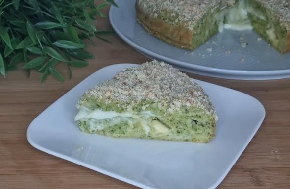 Brokoli odvojite na cvetove pa ih na par minuta ubacite u ključalu vodu. Zatim ih prebacite u činiju i izgnječite viljuškom. Ostavite da se ohladi. U posebnoj činiji umutite jaja sa mlekom. Posolite i pobiberite. Dodajte brašno, rendan sir i prašak za pecivo. Dobro promešajte pa dodajte brokoli. Na kraju u smesu umešajte i kockice kačkavalja. Polovinu smese izlijte u pleh zatim poređajte listiće sira pa prekrijte ostatkom smese. Pospite prezlama i rendanim sirom. Pecite na 190 stepeni 25 minuta.