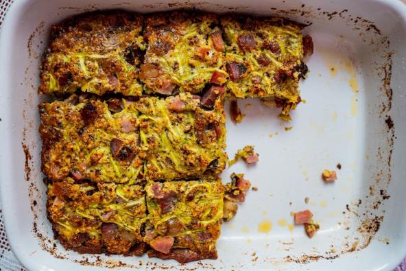 Stari hleb isecite na kockice i rasporedite u vatrostalnu posudu koju ste prethodno nauljili. Čajnu kobasicu i krastavčiće iseckajte na kockice pa ubacite. Dodajte i kukuruz. U jednoj činiji umutiti jaja, pa potom dodati pavlaku i ajvar. Sipati preko hleba, izmešati dodati i začine i peći u zagrejanoj rerni na 200 stepeni oko pola sata.