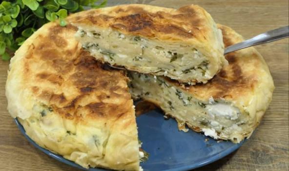 Jaja umutite sa jogurtom, istopljenim puterom, uljem, kiselom vodom i prosejanim brašnom sa praškom za pecivo. U drugoj posudi izgnječite sir, dodajte seckani peršun, kao i smesu sa jajima. Sve dobro sjedinite. Tiganj nauljite, pa stavite dve kore, tako da vire iz tiganja i preko ređajte kore koje ste izgužvali. Sipajte fil, pa pokrijte korom koju ste ostavili sa strane. Preko stavite i kore koje vire iz tiganja i poređajte par kockica putera. Poklopite i pecite sa svake strane po 7 minuta.