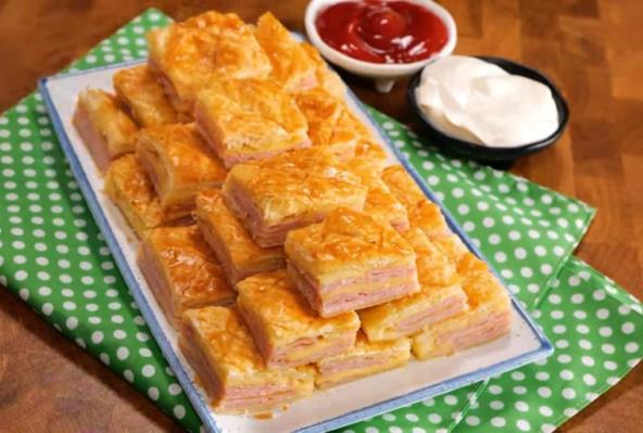 Sir podelite na 2 jednaka dela po 200 g. Jedan deo izrendajte, a drugi isecite na tanke kvadrate. Lisnato testo stavite na pleh obložen pek papirom. Zatim preko stavite šunku, pa kriške sira, opet šunku i rendani sir. Pokrijte drugim slojem testa. Viljuškom pritisnite krajeve, a onda zasecite u obliku dijamanta. Premažite umućenim jajetom. Pecite u zagrejanoj rerni na 180°C oko 25 minuta. Kada se prohladi isecite kocke.