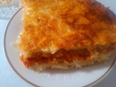 Zatim odozgo još malo pouljiti i rukama zahvatati vodu sa pecivom i pomalo ovlažiti kore. Na kore zatim staviti salamu kečap i sir. Ako volite može malo i origana. Zatim redjati pouljene kore jednu po jednu i svaki red uvek ovlažiti vodom i uljem. Pokriti korom i odozgo pouljiti i ponovo ovlažiti. Peći u zagrejanoj rerni na 200 stepeni C 30 min. Posle 15 minuta pokriti folijom da ne izgori odozgo. Seći vruć burek i služiti uz jogurt