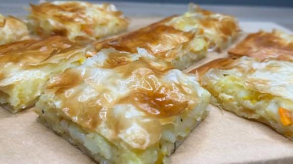 U dubljem tiganju propržite seckani crni i mleveni belu luk, pa dodajte seckanu šargarepu, krompir i papriku. Stavite grančicu ruzmarina i posolite i pobiberite. Pokolopite i dinstajte dok povrće ne omekša. Povremeno promešajte i ako je potrebno dodajte malo ulja. U posudi pomešajte ulje i mleko da se dobro sjedine. Na pleh obložen pek papirom stavite četiri kore tako da se preklapaju i da oblože ceo pleh. Premažite uljem i mlekom. Sipajte polovinu fila i pospite rendanim sirom (100 g). Preko stavite još četiri kore, premažite smesom od ulja i mleka, a onda sipajte drugu količinu fila i pospite preostalim sirom. Poređajte preostale četiri kore, na isti način kao i prethodne. Premažite smesom od ulja i mleka i sve ivici malo savijte na unutra. I njih premažite smesom od ulja i mleka. Pecite u zagrejanoj rern na 180°C oko 20 minuta.