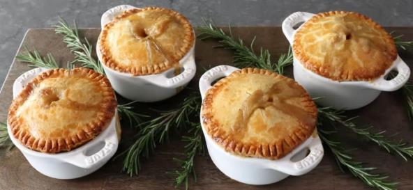 Istopite margarin sa prstohvatom soli u šerpi, pa propržite sitno seckan crni luk. Kada on omekša dodajte sitno seckanu šargarepu i celer, pa nastavite da pržite i dok povrće ne omekša. Zatim dodajte brašno i dobro promešajte. Kad dobije zlatnu boju sipajte bujon i mešajte sve vreme dok se smesa ne zgusne. Zatim sipajte pavlaku za kuvanje, dodajte seckanu šunku, ruzmarin i začine po želji, pa promešajte. Sipajte vodu i ostavite da smesa provri. Zatim smanjite temepraturu i krčkajte još 10 minuta. Dodajte grašak i ako je potrebno još začina, pa promešajte. Kuvajte još par minuta, pa sklonite sa šporeta i ostavite da se ohaladi. U šerpi pomešajte margarin i vodu, pa kada smesa proključa sipajte je u posudu sa brašnom i kašičicom soli. Mešajte dok se sastojci malo ne sjedine, pa umesite testo. Oblikujte loptu, pa malo spljoštite rukama. Ako je testo previše suvo poprskajte vodom i nastavite. Pospite testo brašnom, pa razvucite tanak krug i isecite na 4 trougla. Biće vam potrebne i četiri male posude. Uzmite jedno testo i isecite krug malo veći od otvora posude (taj krug će služiti kao poklopac). Ostatak testa spojite u jednu lopticu, razvucite i utisnite u posudu. Čvrsto pritisnite dno i ivice (ostavite malo da viri), pa napunite nadevom od šunke. Premažite ivice testa koje vire jajetom koje ste umutili sa vodom. Krug od testa takođe premažite jajetom, pa poklopite pitu (premazana strana treba da bude okrenuta ka nadevu). Lepo pritisnite, pa isecite višak testa. Viljuškom pritisnite ivicu, pa premažite jajetom vrh. Zasecite pitu u sredni, u obliku kruga. Na isti način napravite i preostale tri pite. Stavite na pleh na koji ste stavili foliju i pecite u zagrejanoj rerni na 200°C oko sat vremena.