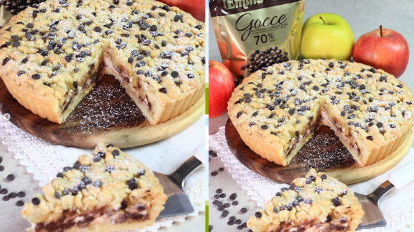 Izbockajte dno viljuškom, dodajte mešavinu krem sira i čokolade i pokrijte jabukama. Preostalo prhko testo mrvite na krupne mrvice preko fila. Završite ukrašavanje čokoladnim dugmićima. Pecite u rerni zagrejanoj na 180°C oko 40 minuta. Uživajte! Možda ćete želeti da napravite i slatku kukuruznu pitu.