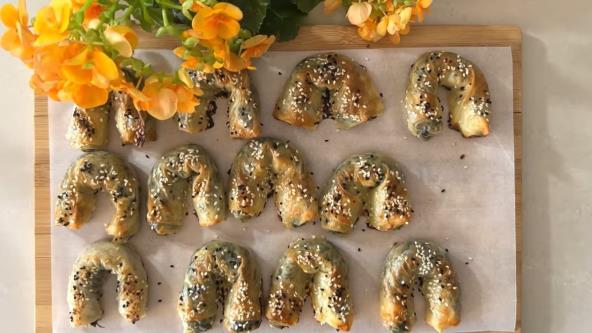 Preklopite bočne strane, zatim pažljivo urolajte u oblik rolne, dobro zatvarajući fil unutra. Blago savijte rolnicu u oblik slova „C“ i stavite je na pleh obložen papirom za pečenje. Ponavljajte postupak dok ne iskoristite sav materijal. Premažite svaku rolnicu ostatkom smese od jajeta i mleka kako bi dobile zlatnu boju prilikom pečenja. Po želji pospite susamom i crnim kimom za dodatnu aromu i hrskavost. Pecite u prethodno zagrejanoj rerni na 175°C oko 35 minuta, dok rolnice ne postanu zlatno-smeđe i hrskave.Ostavite ih da se malo prohlade pre služenja. Najhrskavije su dok su sveže iz rerne, ali će blago omekšati tokom vremena.