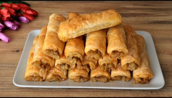 Od odmorenog testa formirajte 6–8 kuglica. Svaku razvucite oklagijom na pobrašnjenoj površini što tanje možete. Otopite puter i pomešajte sa uljem. Svaku razvučenu koru premažite ovom mešavinom. Na jednu stranu kore rasporedite kašiku-dve fila, pa urolajte u rolnicu. Ređajte u podmazan pleh i premažite odozgo uljem. Pecite u unapred zagrejanoj rerni na 200 °C oko 30–35 minuta, dok ne porumene.