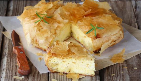 4. Kada stavite poslednju koru, pitu izbockajte nožem pa je zalijte vodom i pomerajte tepsiju levo-desno da se voda ravnomerno rasporedi.