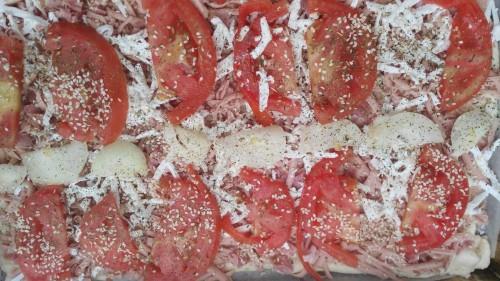 Kvasac potopiti u malo mlake vode pa dodati 1 čašu od jogurta mlakog mleka, bršno, so ulje i zamesiti testo. Pokriti da malo naraste. Razviti testo veličinu tepsije ( 40 x 25 sm) namazati uljem površinu testa, naviti ga na oklagiju i prebaciti u pleh koji ste obložili papirom. Na testo narendati parizer a slaninicu iseckati u secku ili ručno u sitne kockice pa i nju rasporediti preko.Narendati sir a paradajz nasecite na tanke kriške pa rasporedite po tepsiji. Isto to uradite i sa lukom. Pospite origanom i susamom. Ostavite 10 min. da odmara na toplom pa pecite u zagrejanoj pećo 20 min. na 200 stepeni C