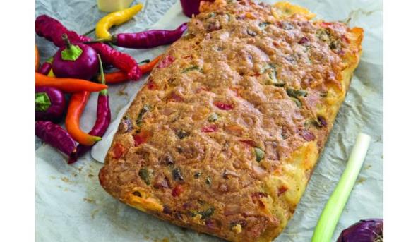 2. Kačkavalj, papriku i masline takođe iseckajte. Umutite jaja. Kada zapene, dodajte svinjsku mast i mutite još malo. Zatim stavite proseno brašno i prašak za pecivo, a onda i speltino brašno. Na kraju dodajte slaninu, kačkavalj, papriku i masline.