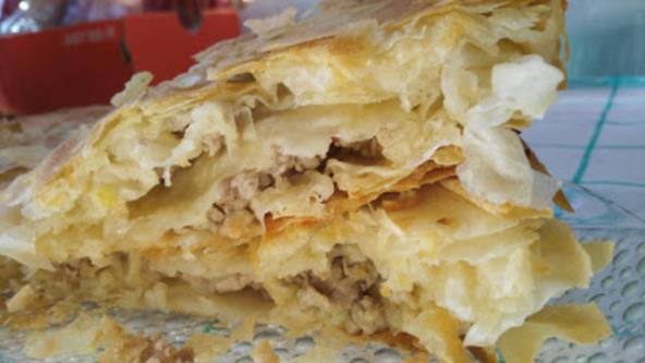Luk iseckati, pa propržiti na ulju dodati začin i biber malo još propržiti. Pola peciva staviti u malo tople vode. Kore redjati kao na videu prskati malo viodom i filovati prženim mlevenim mesom. Pokriti zadnjom korom pokvasiti koru malo i pouljiti i peći na 180 stepeni C oko 30 min. Služiti uz jogurt kao doručak.