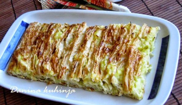 3. Jedan list kore za piru četkom premazati sa malo ulja staviti smesu od praziluka i krompira i koru savijati kao harmoniku, staviti u pleh obložen papirom. Tako uraditi sa svim korama slagati jednu do druge kao harmoniku.