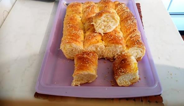 2. Naraslo testo podeliti na 4 dela. Sir izgnječiti i dodati jaja pa izmešati. Razviti prvi deo testa u obliku pravougaonika pouljiti i namazati filom od sira i jaja. Razvući i drugi deo testa pa pokriti preko prvog testa, ponoviti postupak i sa trećim. Četvrti razviti ali samo pouljiti. Preceći nožem uzdužno na 4 dela pa svaki deo uvijati i stavljati u pleh u koji ste stavili hartiju.