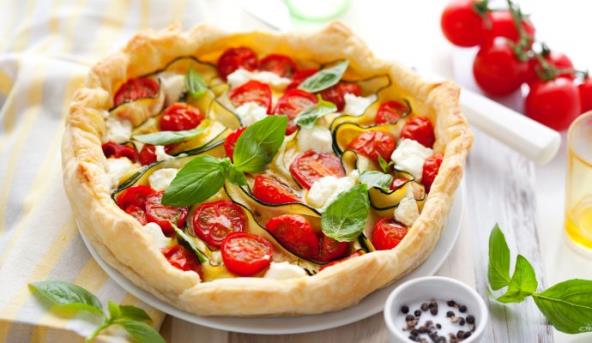 3. Testo razvijte između dva komada papira za pečenje na debljinu od 1 cm, gornji papir pažljivo uklonite, dno na par mesta izbockajte viljuškom pa na testo rasporedite povrće tako da ostavite 3 cm na rubovima prazno. Rubove preklopite prema povrću.