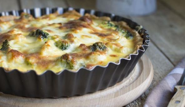 3. U posoljenoj kipućoj vodi obarite buketiće brokolija, karfiola i iseckane tikvice oko 5 minuta, iscedite i isperite hladnom vodom. Dobro ocedite na papirnoj salveti, pa rasporedite povrće preko kore, dodajte seckani crni luk i pospite rendanim pačkavaljem.