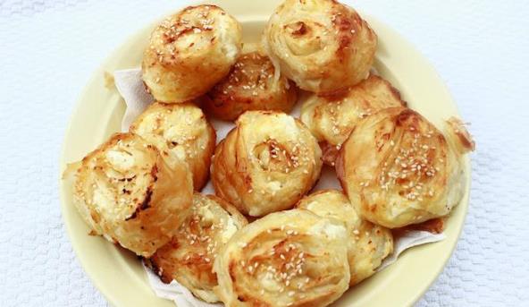 1. Ulje i vodu izmešati i isprskati između tri kore. Ne treću koru pobaca malo sira, umotati rolat i seći manje komade, pužiće. Tako raditi i sa ostalim korama.
