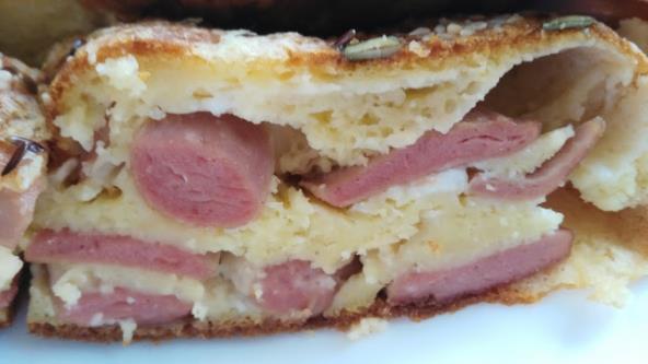 Sve laganao izmešati Dodati zatim griz, izmrvljen sir i sve izjednačiti. Viršle iseći na kolutove pa i nji dodati. Sipati u pleh veličine 24 s. peći na 180 stepeni C 40 min. Služiti uz jogurt za doručak ili večeru. Prijatno!