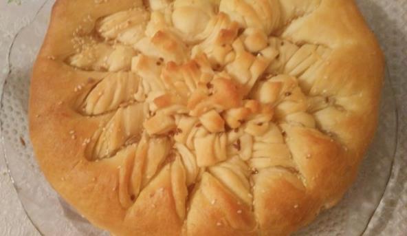 3. Lopticu koja je ostala razviti oklagijom oblika lenjira, namazati margarinom preklopiti i još jednom razvijati i preklopiti pa ivice izreckati i uviti da se dobije cvet koji stavljamo u centar pogače. Sada pogaču zajedno sa papirom prebacite u okruglu tepsiju.