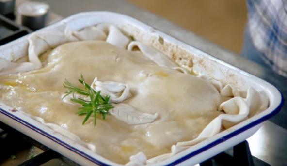 5. Za kraj prekrijte tepsiju gotovim lisantim testom. Ušuškajte višak, premažite jajetom kako biste dobili zlatno-žutu koricu i pecite na 200 stepeni svega 15 minuta.