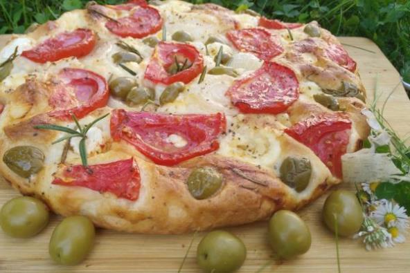 3. VDrškom varjače napraviti rupe na testu, pa poređati kockice sira, belog luka, zatim listove crnog luka paradajza, masline, listiće ruzmarina i origano.