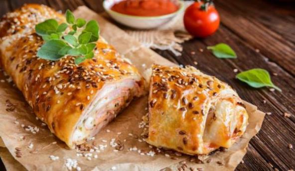 3. Po širini staviti 3-4 kašike prženog suhomesnatog, saviti ivce i uviti u rolat.