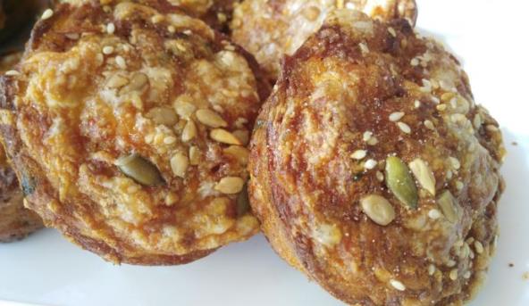 4. Mafin kalupe namazati uljem i puniti ih pripremljenom smesom. Poravnati kašikom, dodati odozgo narendanog parmezana i posuti semenkama.