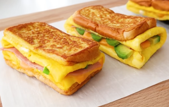Isecite tost hleb na pola po dužini. Umutite 2 jajeta sa malo seckanog mladog luka. Istopite puter, pa sipajte jaja. Stavite preko 2 isečena parčeta hleba. Umočite u jaja sa obe strane i stavite na sredinu. Okrenite jaja zajedno sa hlebom. Preklopite jaja na unutra sa svake strane, pa na jednu stavite 2 polovine šunke, a na drugu 2 polovine sira. Šunku i sir stavljate jednu preko druge. Preklopite hleb i pržite još kratko. Ako želite možete umesto šunke da stavite slaninu ili preko šunke avokado.