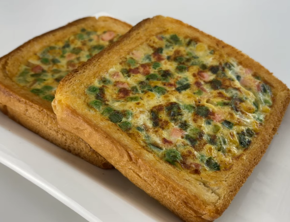 Isecite sredinu hleba, tako da ostanu samo korice. U nauljen tiganj stavite grašak, kukuruz, sitno iseckan vlašac i kobasicu, sve začinite i ostavite da se kuva nekoliko minuta. Izručite sve u jednu posudu i pomešajte sa jajima, pa u tiganj stavite koricu od dva parčeta tosta koju ćete puniti dobijenom smesom od povrća. Prekrijte parčetom mocarele, pa preko stavite sredinu hleba koju ste isekli na početku. Ostavite da se prži oko 4 minuta, pa okrenite na drugu kako bi i ona dobila zlatnu boju.