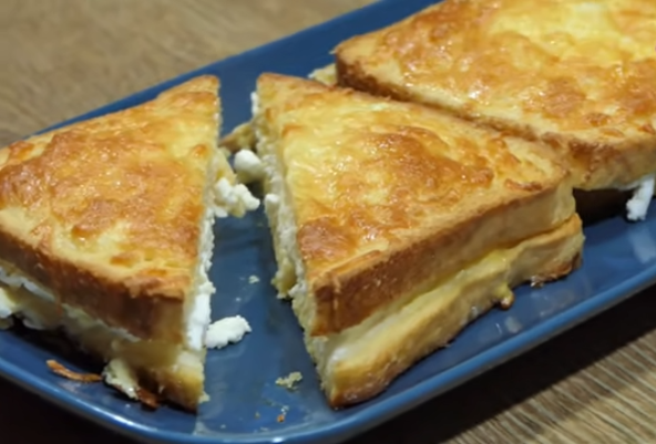Posolite i umutite jaja sa istopljenim puterom. U dobijenu smesu umočite dve kriške hleba, pa stavite u pleh koji ste premazali istopljenim puterom ili uljem. Na svaku krišku stavite komad fete, a zatim preostale dve kriške umočite u smesu od jaja i stavite preko fete. Prelijte sa smesom od jaja koja je ostala i pospite rendanim sirom. Pecite u zagrejanoj rerni na 200°C oko 15 minuta.