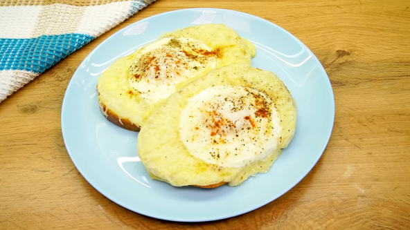 Premažite pleh puterom i poređajte kriške hleba. Na svako parče stavite veću količinu rendanog sira i prstima napravite rupu na sredini (tako da sir bude po ivici hleba). U svaku rupu stavite po jedno razbijeno jaje. Začinite po želji i sipajte malo ulja na svaki sendvič. Pecite u zagrejanoj rerni na 190°C oko 10 minuta.