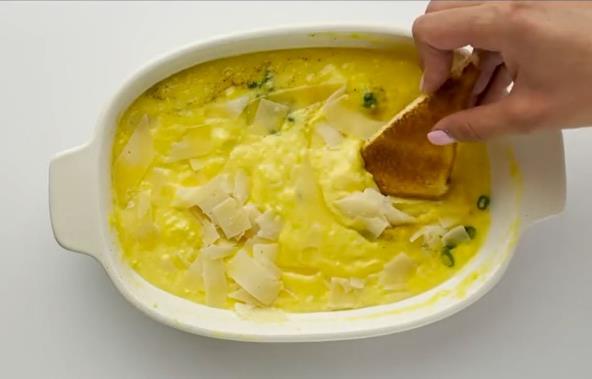 Jaja umutite viljuškom kao da pravite klasičnu kajganu. Dodajte mleko, pa još malo promešajte. U vatrostalnu posudu stavite kocku putera u sredinu, pa dodajte mućena jaja, a potom pospite rendanim kačkavljem. Pecite u prethodno zagrejanoj rerni na 180 stepeni oko 15 minuta. Kada je gotovo dodajte začine po ukusu, pa promešajte sve varjačom, a po želji odozgo dodajte nariban parmezan i malo seckanog peršuna. Služite uz prepečeni tost hleb.