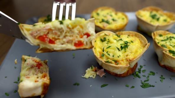 Isecite tortilju pomoću okruglog kalupa, pa poređajte u kalup za mafine. Lepo utisnite. Jaja umutite sa mlekom, pa posolite i pobiberite. Sipajte u svaku tortilju, pa dodajte sitno sekcanu papriku, šunku i preko pospite rendani sir. Pecite na 180°C oko 15 minuta.