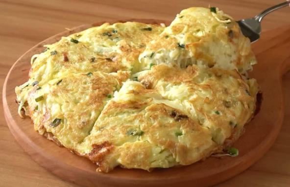 Krompir oljuštite i izrendajte, pa pomešajte sa jajima koja ste prethodno umutili, sekcanim mladim lukok, pa posolite i pobiberite. Sve dobro promešajte. U tiganj sipajte malo ulja, pa kada se zagreje dodajte pola smese sa krompirom i lepo rasporedite po celom tiganju. Možete i da poklopite, a kada krompir dobije zlatnu boju sa donje strane, okrenite na drugu pomoću špatule. Pržite još 2-3 minuta, pa izvadite iz tiganja. U isti sipajte još malo ulja, pa stavite drugu polovinu smese sa krompirom. Pripremite na isti način kao i prvu polovinu smese. Kada okrenete "palačinku" od krompira na drugu stranu, pospite rendanim sirom i preklopite prvom "palačinkom" od krompira (koju ste izvadili na tanjir). Ostavite još par minuta u tiganju i servirajte.