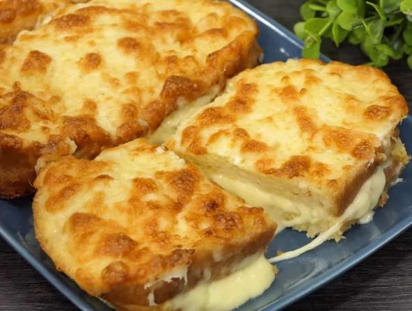 Tri parčeta hleba stavite u pleh i viljuškom napravite rupe na par mesta (kako bi što bolje upio smesu). Umutite jaja sa mlekom i posolite, pa prelijte preko pola količine. Ostavite 5 minuta da hleb dobro upije. Preko pospite rendani sir (može i kriške) i stavite preostale kriške hleba. I te kriške viljuškom probušite, prelijte preostalom smesom od jaja, pa lagano pritisnite i ostavite da upije još 5 minuta. Preko stavite parče putera i pospite rendanim sirom. Pecite u zagrejanoj rerni na 200°C oko 20 minuta.