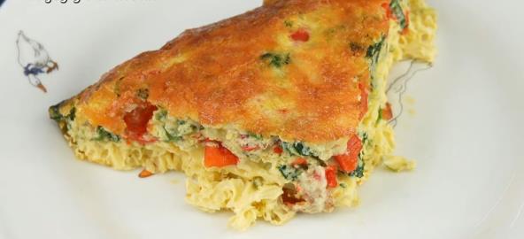 Zagrejte rernu na 180 °C. U tiganju zagrejte maslinovo ulje na srednje jakoj vatri. Dodajte luk i dinstajte dok ne omekša. Dodajte papriku i beli luk, pa nastavite da dinstate još 2-3 minuta. Dodajte spanać i mešajte dok ne uvene, zatim sklonite sa vatre. U posebnoj posudi umutite jaja sa solju i biberom. Dodajte 1/3 mocarele i promešajte. Umešajte pripremljeno povrće u jaja i dobro sjedinite.