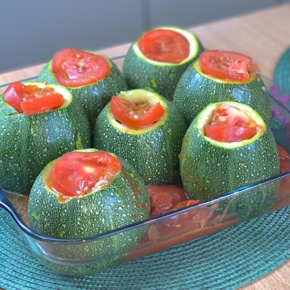 Fil ispržiti i začiniti po ukusu. Kada se ohladi dodati jedno jaje i lepo promešati. Tikvice oprati, iseći vrhove i izdubiti pa puniti filom. Zatvarati kolutom paradajza. Staviti ih u nauljenu posudu za pečenje i dodati paradajz pelat. Peći na 180 stepeni 45-50min. Prijatno!