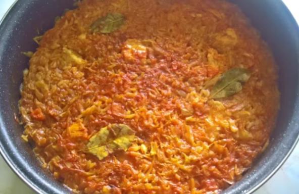 Zatim dodajte seckani kupus i kada malo omekša sipajte pasirani paradajz. Začinite i promešajte. Na kraju dodajte opran i oceđen pirinač, a vodu pomešajte sa sirćetom i sipajte preko. Sve dobro promešajte i stavite lovorov list.
