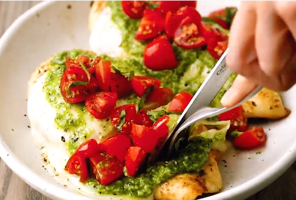 Belo meso isecite na tanke šnicle i posolite i pobiberite. Zatim ih propržite u zagrejanom ulju ili na grilu, i izvadite na tanjir da malo omekšaju. U isti tiganj dodajte čeri paradajz i kratko propržite. Zatim sipajte par kašika pesto sosa (po želji) i vratite meso. Ako je potrebno dodajte još malo maslinovog ulja. Još kratko pržite i poslužite.