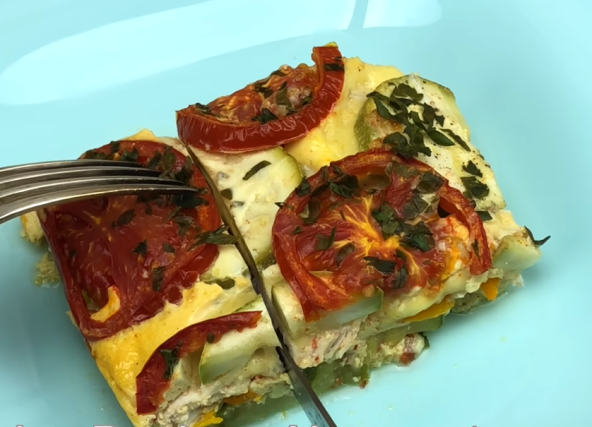 Iseći pileći file na tanke listiće i posoliti. Tikvicu iseći na kolutove pa poređati na nauljen pleh, ali tako da se popune sve šupljine (pogledajte galeriju fotografija). Papriku isecite i stavite preko tikvica. Zatim poređajte piletinu. Kačkavalj izrendajte pa rasporedite preko piletine, zatim još jedan red tikvica pa preko paradajz na kolutove.