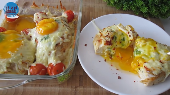 Svaki komad mesa zasecite dublje da naprvite džep. Zgužvajte alu foliju i stavite u svaki džep. Zatim meso začinite sa obe strane i propržite u tiganju. Peršun iseckajte, pa dodajte sitan beli sir i belanca unutra i sve lepo sjedinite. Izvadite meso iz tiganja, sklonite foliju i napravljenom smesom napunite praznine (džepove). Čačaklicu stavite po sredini mesa. Nauljite tepsiju i poređajte piletinu, a okolo stavite čeri paradajz. Pecite u zagrejanoj rerni 15 minuta na 200°C. Izvadite čačkalicu, pospite rendanim tvrdim sirom i na svako parče stavite po jedno žumance. Vratite u rernu na još 5 minuta.