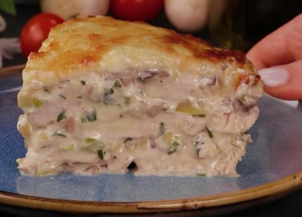 Piletinu isecite na veće komade, pa poređajte u nauljenu tepsiju. Pokrijte dno, a zatim posolite i pobiberite. Pečurke i tikvice iseckajte, pa propržite. Sipajte povrće u posudu, posolite i pobiberite, dodajte rendani tvrdi sir, seckani peršun i krem sir. Sipajte preko mesa i tako ređajte meso, kremasto povrće. Poslednji sloj treba da bude povrće. Preko stavite rendanu mocare i pecite u rerni na 180°C nekih 25 minuta.