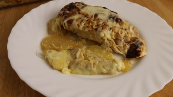 Krompir isecite na kolutove, pečurke na kriške, a luk sitno. Nauljite vatrostalnu posudu, stavite krompir, malo posolite, zatim luk, pa pečurke. Preko belo meso i sipajte i preostali sos koji je ostao u posudi. Pecite u zagrejanoj rerni na 180°C nekih 45 do sat vremena. Zatim preko pospite rendani sir i vratite u rernu samo dok se sir ne otopi.