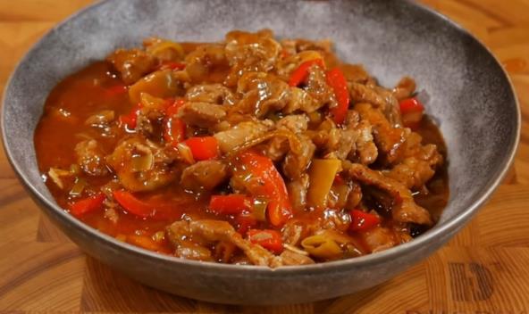 Isecite meso na kockice, pa preko sipajte soja sos, vorčester sos i začinite. Dobro rukama promešajte da se svi sastojci sjedine. Pokrijte i ostavite da stoji nekih pola sata. Crni luk, pečurke, beli luk, praziluk i papriku iseckajte. U zagrejanom tiganju na malo ulja prvo propržite meso, pa ga izvadite. U isti tiganj dodajte pečurke i luk. Kada se prodinstaju sipajte paradajz sok. Zatim dodajte papriku i beli luk. Kada se sve to prodinsta stavite u šerpu u koju ste preručili meso. dodajte bujon, a skrob pomešajte sa vodom, pa sipajte i to. Ako želite dodajte i čili sosa malo. Kuvajte nekih 5-10 minuta.