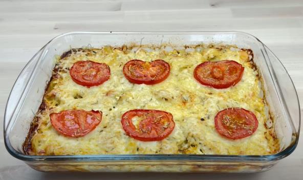 Vatrostalnu posudu, u kojoj ćete peći, podmažite uljem. Luk isecite na brkove i rasporedite po dnu posude. Krompir isecite na kolutove i poređajte preko luka, pa posolite i pobiberite i prelijte malo maslinovim uljem. Pileći file isecite na kockice, takođe začinite i rasporedite po krompiru. U činiji napravite preliv. Umutite jaja sa pavlakom za kuvanje i začinima pa prelijte preko luka, krompira i mesa. Prekrijte zatim posudu papirom za pečenje i alu folijom i pecite u zagrejanoj rerni 30 min. na 180 stepeni. Kada se ispeče odozgo pospite rendanim kačkavaljem, stavite kolutove paradajza, pospite maslinovim uljem i vratite u rernu na još 10 min.