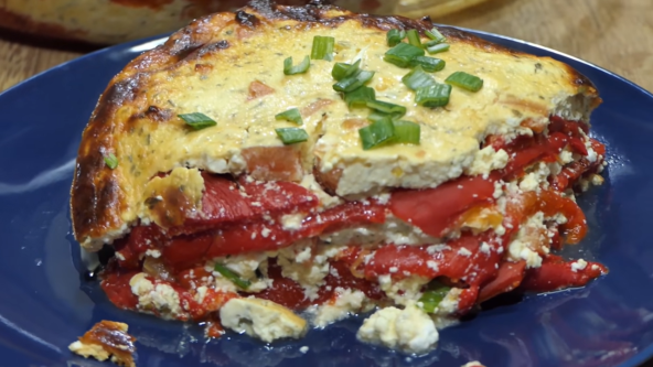 Umutite jaja, pa dodajte izmrvljeni sir, jogurt, sitno seckani paradajz i sitno seckani beli luk. Začinite origanom i peršunom. Tepsiju premažite puterom, pa poređajte red pečenih paprika. Prelijte ih dobijenom smesom i ponovo poređajte red pečenih paprika. Tako ređajte dok ne dobijete 3 sloja, a poslednji neka bude smesa. Pecite u zagrejanoj rerni na 190°C nekih 25 minuta.