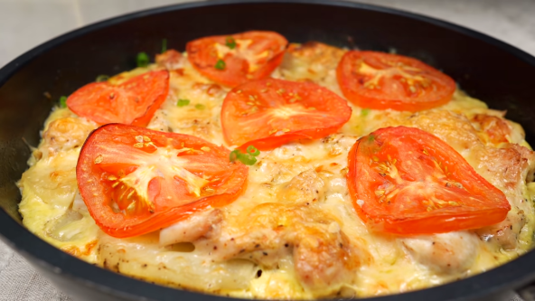 Isecite meso na kockice, krompir na kolutove, a luk na rebarca. Nauljite tepsiju, pa stavite prvo luk, pa krompir, pa meso. Začinite po želji. U jaja dodajte pavlaku za kuvanje, provansalsko bilje i kari, pa umutite. Pokrijte alu folijom, pa pecite na 200°C nekih 40 minuta. Skinite foliju, pospite rendani sir, pa poređajte kolutove paradajza i vratite na nekih 10 minuta.