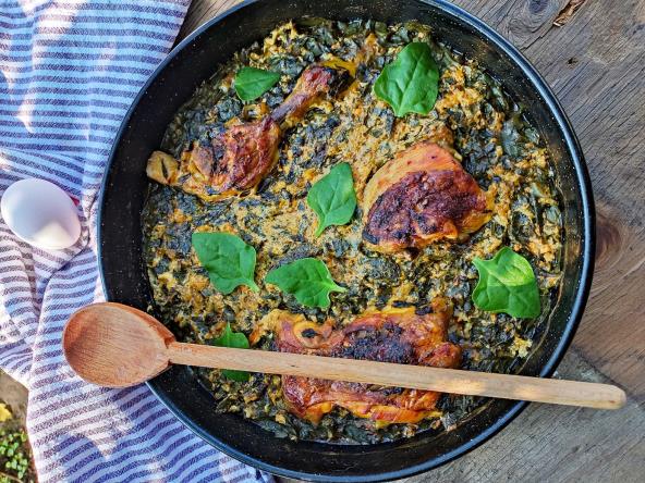 Meso prvo skuvajte, a spanać očistite i operite, pa ga prelijte ključalom vodom da omekša. Ocedite ga i kada se ohladi iseckaje. Crni luk sitno iseckajte, pa stavite da se prži, na tihoj vatri. Zatim dodajte šargarepu, pirinač i još kratko propržite. Zatim dodajte iseckani spanać, beli luk, mlevenu crvenu papriku. Promešajte, pa nalijte vodom u kojoj se kuvalo meso. Posolite, začinite i poređajte meso. Pecite na 200°C oko pola sata. Jaja, mleko, kiselu pavlaku dobro razmutite, pa prelijte preko spanaća i pecite još nekih 15 minuta.