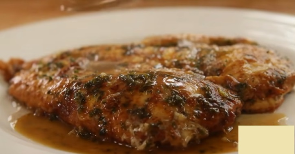Posolite i pobiberite jaja, pa ih umutite. Dodajte sitno secakni peršun (pola količine), kao i parmezan. Promešajte. Isecite meso na šnicle, pa ga izlupajte. U tanjir sipajte brašno, pa uvaljajte piletinu, otresite višak. Zatim stavite meso u smesu sa jajima, pa u tiganj u kojem ste prethodno zagrejali ulje i puter. Ispržite piletinu sa obe strane i isključite šporet. Izvadite meso i u isti tiganj sipajte vino, pa bujon i sitno seckani ili izgnječeni beli luk. Na kraju sipajte limunov sok i ostavite da tečnost ispari na jačoj temperaturi nekih 2 minuta. Dodajte preostalu polovinu seckanog peršuna i ostatak putera i mešajte dok se puter ne rastopi na tihoj vatri. Vratite piletinu u sos i nastavite da zagrevate piletinu na laganoj vatri ne više od 30 sekundi.