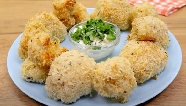 Napravite ukusne hrskave zalogaje od karfiola sa sočnim umakom od jogurta i majoneza. Spremljen na ovakav način svi će ga jesti čak i oni kojima smeta miris karfiola dok se kuva. Tajna je u smesi za pohovanje, koja, pored uobičajenih jaja, brašna i prezli sadrži i parmezan, beli luk i začine koji daju bogatiji ukus.